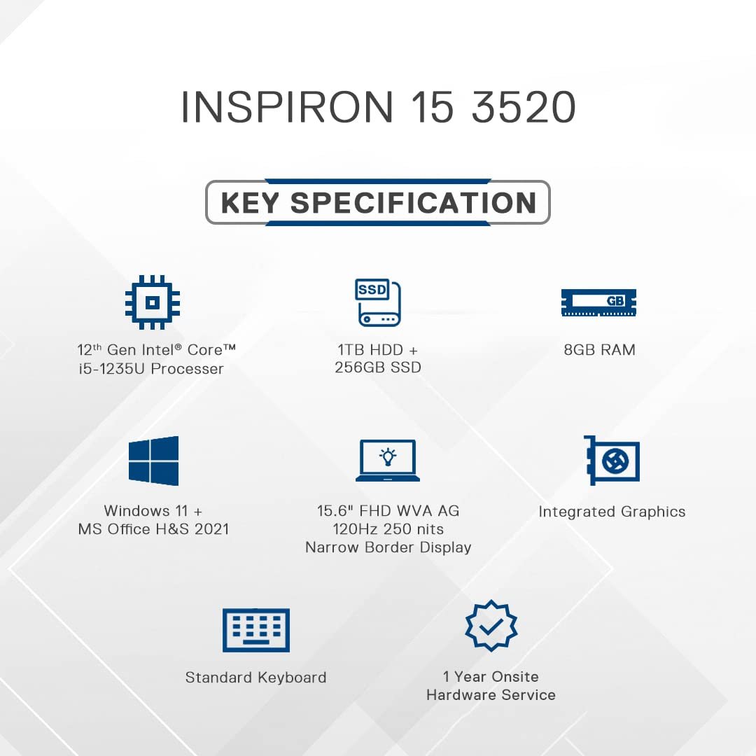 Dell Inspiron 3520 Laptop,12th Gen Intel Core i5-1235U, Windows 11 + MSO’21, 8GB, 1TB HDD + 256GB SSD, 15.6″ (39.62Cms) FHD WVA AG 120Hz 250 nits, 15 Month McAfee, Black, 1.65Kgs